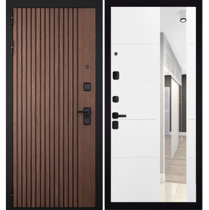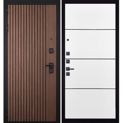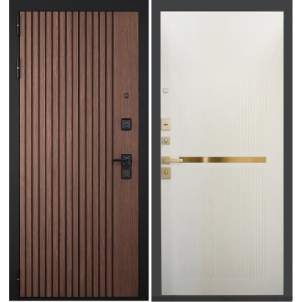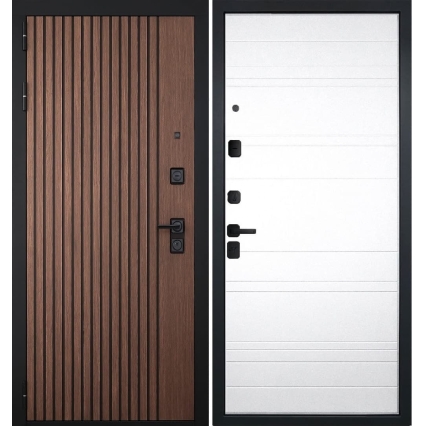 Снаружи дверь имеет красивую внешнюю декоративную панель, которую эстетично дополняют МДФ-наличники в тон панели. Декоративная накладка с логотипом двери, как защита от подделок, расположена на торце дверного полотна.