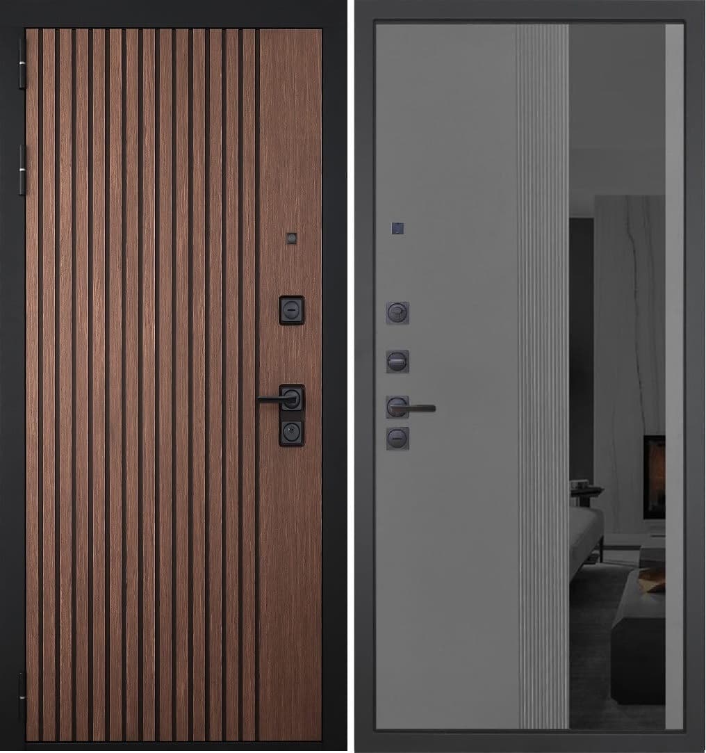 Входная дверь ГРАНИТ Шторм-86 Зеркало черное (ПВХ Серый софт)